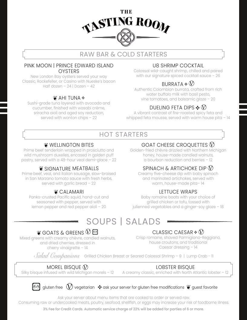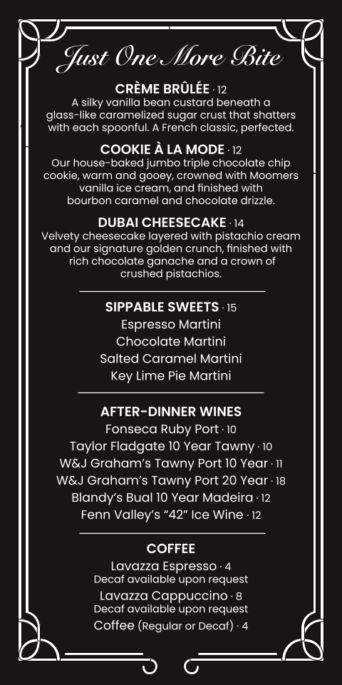 New Zealand elk grilled to order, finished with our house whiskey-black garlic sauce, roasted potatoes, and seasonal vegetables